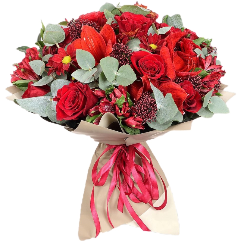 Альстромерия, Амариллис, Ранункулюс, Роза, Скиммия, Хризантема |