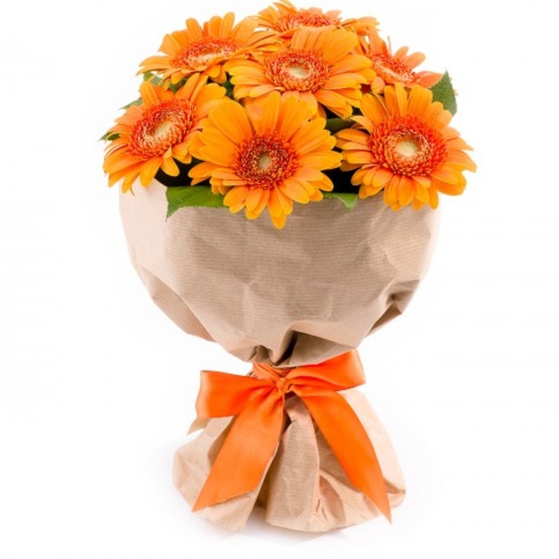 Букет состоит из 7 оранжевых гербер, рускус, крафт, атласная лента.