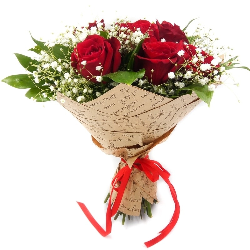 Букет состоит из 9 красных роз, 2 ветки гипсофилы, крафт, атласная лента.