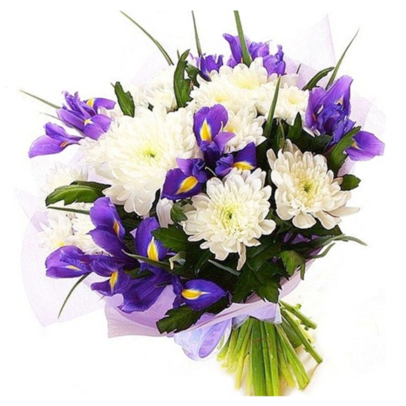 Букет состоит из 11 ирисов, 5 веток хризантемы, прозрачная упаковка, атласная лента.