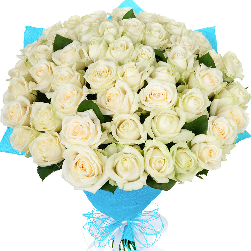 Букет состоит из 55 белых роз, красивая упаковка, атласная лента.