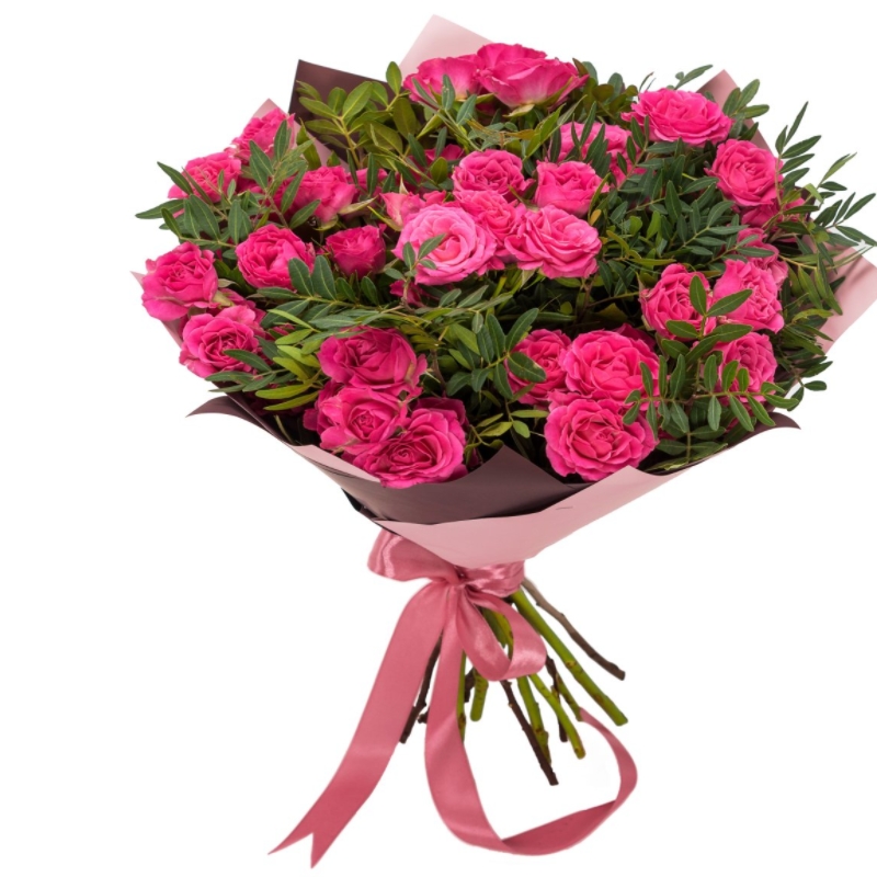 Букет состоит из 9 розовых кустовых роз, зелень, крафт, атласная лента.