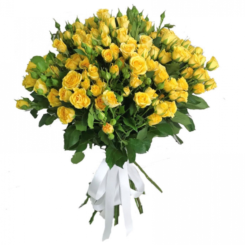 Букет состоит из 27 желтых кустовых роз, прозрачная упаковка, атласная лента.