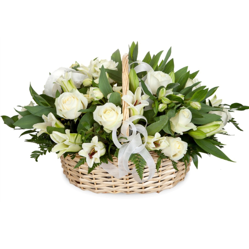 Букет состоит из 11 белых роз, 6 альстромерий, 4 лилии, зелень, корзина, оазис.
