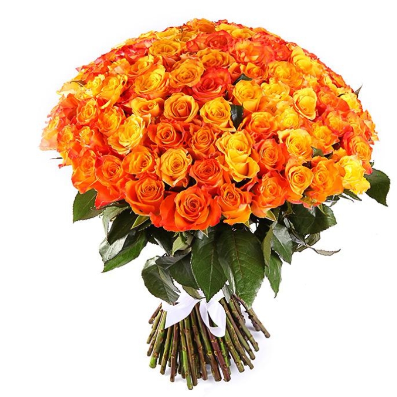 Букет состоит из 101 оранжевая роза, прозрачная упаковка, атласная лента.