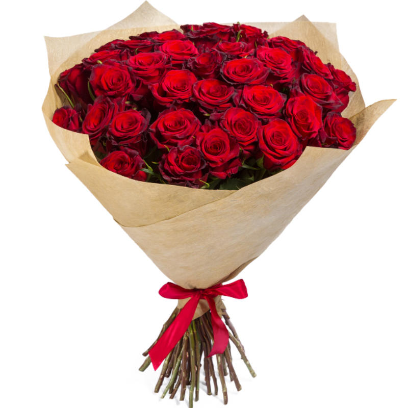 Букет состоит из 51 красная роза, крафт, атласная лента.